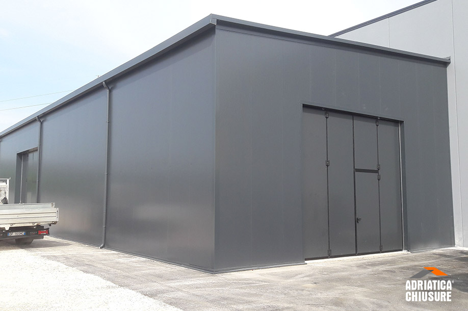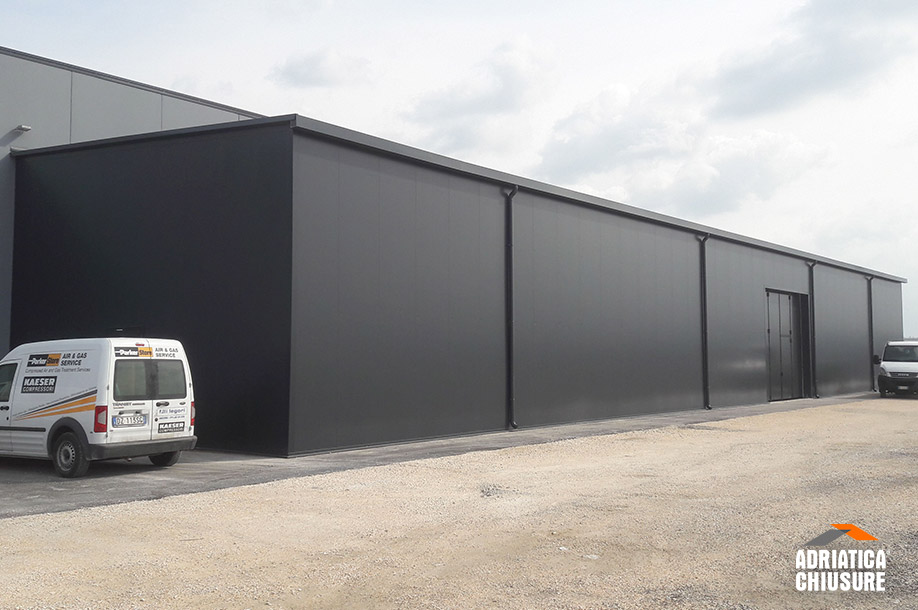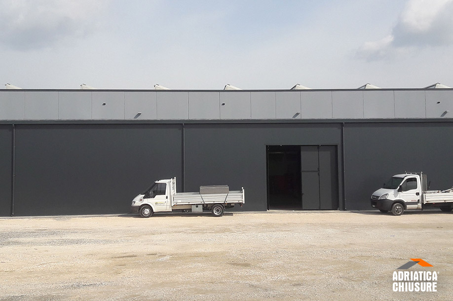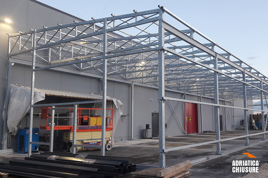 Il capannone con pannelli sandwich e copertura mono-pendenza progettato da Adriatica Chiusure (largo 10 m, profondo 40 m e alto 5 m) presenta una struttura in carpenteria metallica zincata a caldo costituita da una successione di portali paralleli, formati ciascuno da due colonne su cui poggiano la trave laterale, le capriate e gli arcarecci.