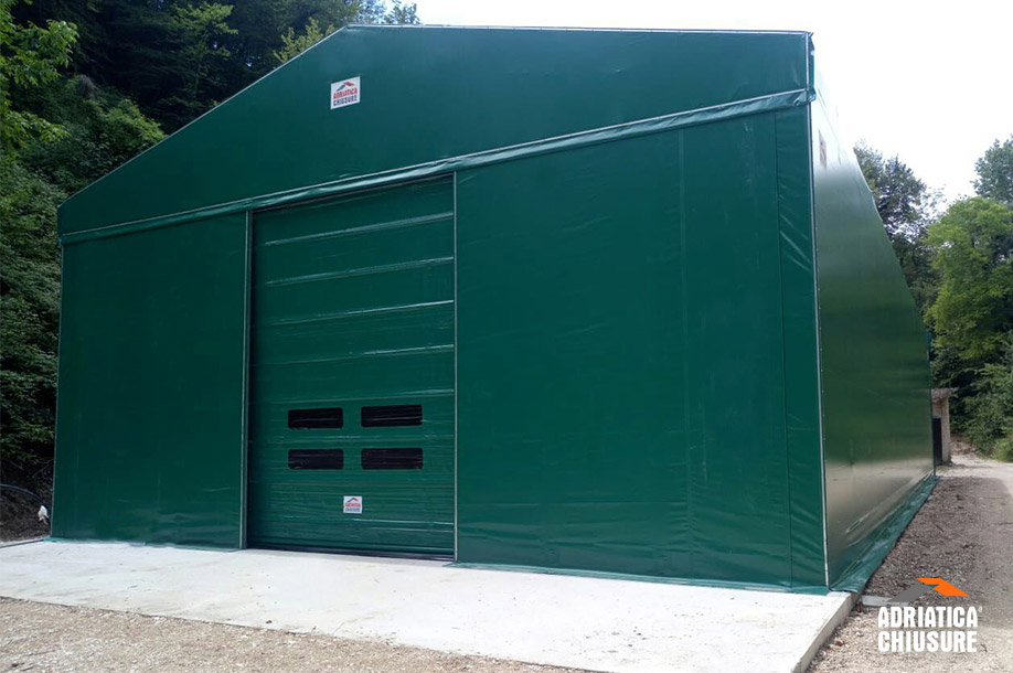 Adriatica Chiusure ha realizzato per un’azienda agricola di Corridonia, in provincia di Macerata, una stalla per bovini. Per rispondere alle particolari esigenze del cliente, è stata progettata una struttura in carpenteria metallica larga 12 m, profonda 27 m e alta 5 m, completa di pareti, tamponamenti laterali e copertura in PVC. La scelta del telo verde è stata dettata dal limitare al minimo l’impatto ambientale. Sul lato anteriore, in posizione centrale, il cliente ha richiesto l’inserimento di una porta rapida in PVC mentre sul lato posteriore è stata installata una tenda a doppia ripartita apribile per tutta la lunghezza del tunnel.