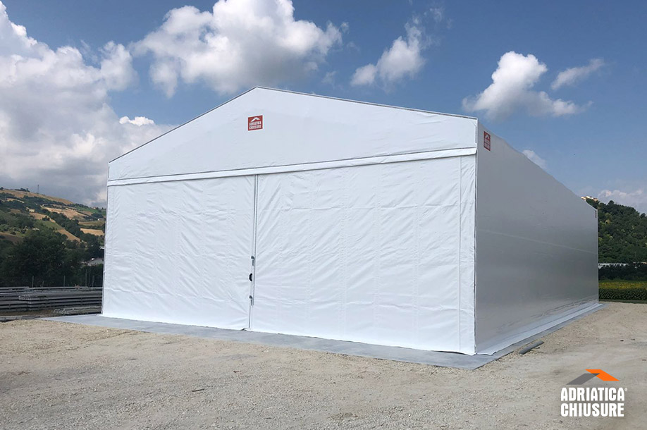 Nel caso specifico, il cliente ha optato per un telo di copertura in PVC bianco e l’inserimento frontale di una tenda scorrevole a doppia ripartita. La struttura è stata consegnata nei tempi standard di 30-40 giorni.