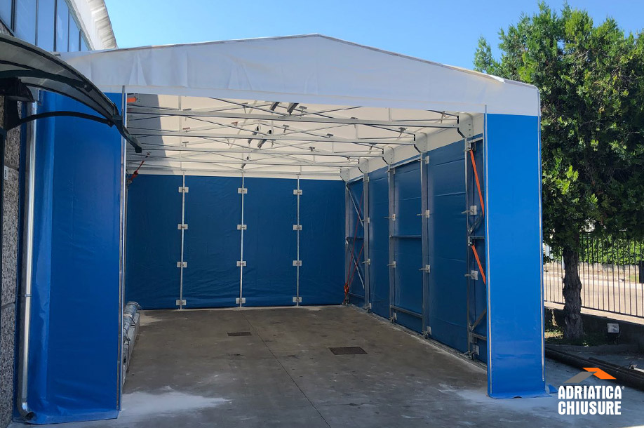 M.A. Lavorazioni Metalmeccaniche ha chiesto l’intervento di Adriatica Chiusure per realizzare un tunnel mobile adiacente al proprio stabilimento, a Gabicce Mare (PU). Il cliente necessitava di una copertura laterale di 5,7 m di larghezza, 8,2 m di profondità e 3,2 m di altezza per lo stoccaggio di materiali industriali. Per garantire l’altezza utile, lo Staff Tecnico di Adriatica Chiusure ha progettato una copertura con doppia pendenza con inserimento di un canale di raccolta delle acque tra le due strutture per favorire il normale deflusso.