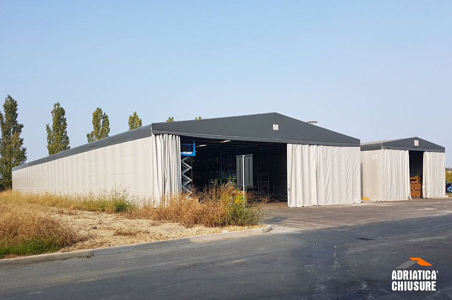 Su richiesta del cliente, il capannone è stato personalizzato con due coppie di tende scorrevoli a doppia ripartita apribili manualmente, larghe 18,84 m e alte 4,8 m, in PVC autoestinguente in classe II. Il capannone è stato consegnato in 60 giorni dalla conferma d’ordine.